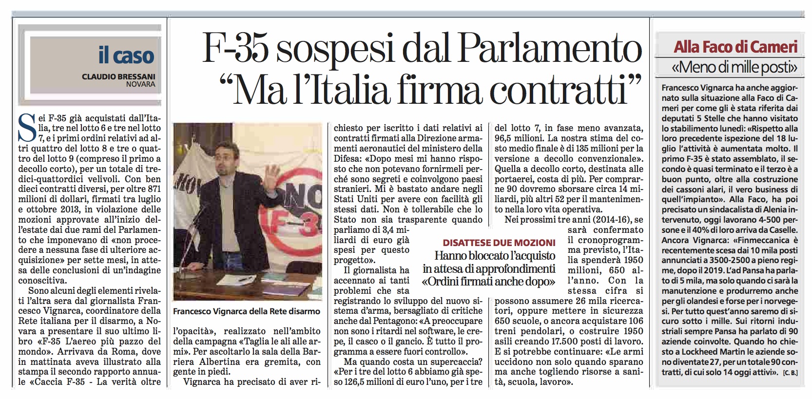Vignarca ha precisato di aver richiesto per iscritto i dati relativi ai contratti firmati alla Direzione armamenti aeronautici del ministero della Difesa: «Dopo mesi mi hanno risposto che non potevano fornirmeli perché sono segreti e coinvolgono paesi stranieri. Mi è bastato andare negli Stati Uniti per avere con facilità gli stessi dati. Non è tollerabile che lo Stato non sia trasparente quando parliamo di 3,4 miliardi di euro già spesi per questo progetto».