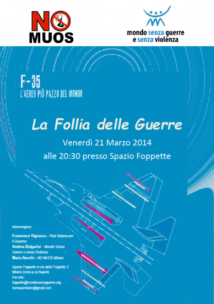 Il Comitato NO MUOS Milano e l’associazione Mondo senza Guerre e senza Violenza presentano “La Follia delle Guerre”. La presentazione del libro di Francesco Vignarca “F-35. L’aereo più pazzo del mondo” offre l’occasione per riflessione ad alta voce sulle politiche militari (MUOS, flotta Cavour, droni, F-35, ampliamento basi militari…).