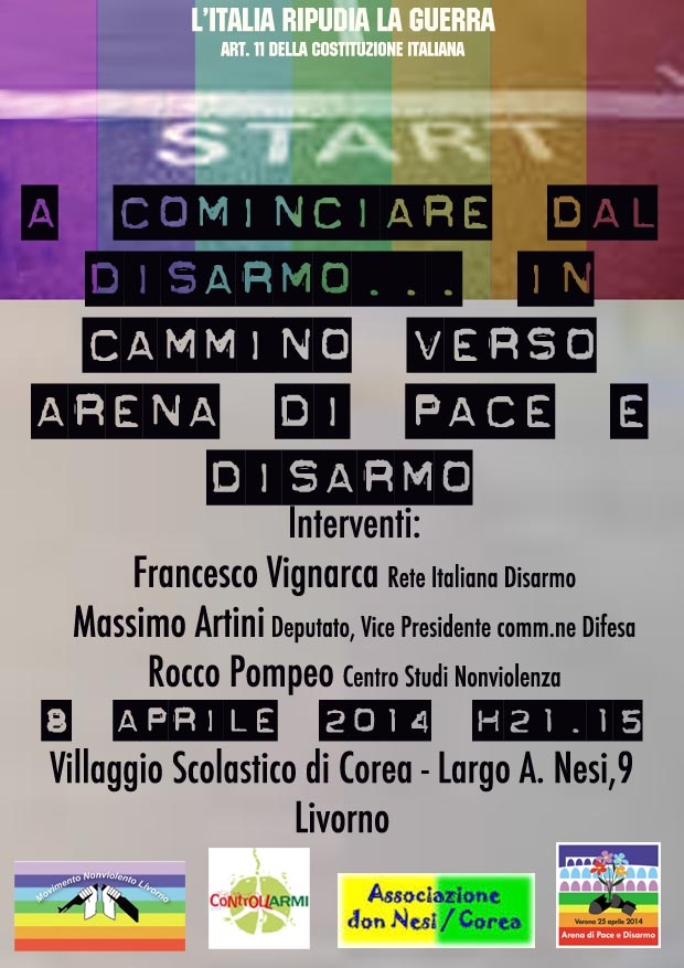 Si inizia da Livorno, con un bel confronto organizzato dalla sezione del Movimento Nonviolento della città toscana: “Cominciare dal disarmo… in cammino verso Arena di Pace e Disarmo”. L’appuntamento è per le 21.15 di martedì 8 aprile al Villaggio Scolastico di Corea in Largo Nesi 9 ed insieme a me animeranno la serata Rocco Pompeo del Centro Studi Nonviolenza e Massimo Artini, Deputato del Movimento 5 Stelle (è Vicepresidente della Commissione Difesa della Camera) verso il quale nutro una grande stima per come sta portando avanti il proprio lavoro istituzionale in questi mesi.