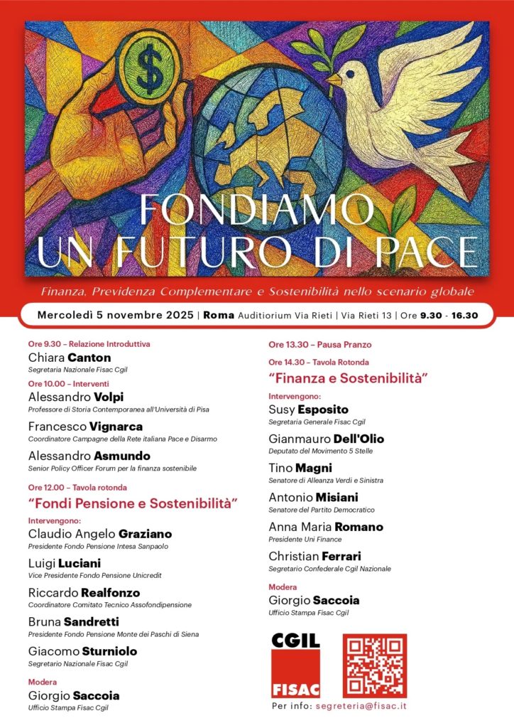 Con l’iniziativa “Fondiamo un futuro di Pace” la Fisac Cgil invita a fermarsi e a riflettere: quale finanza vogliamo? Quale ruolo deve avere la previdenza complementare? E quanto le cittadine e i cittadini, le lavoratrici e i lavoratori sono consapevoli delle scelte che riguardano i loro risparmi e il loro domani? “Fondiamo un futuro di Pace” non è solo un titolo, ma una sfida collettiva: costruire una finanza che torni a servire la società, i diritti, la sostenibilità e soprattutto la pace.