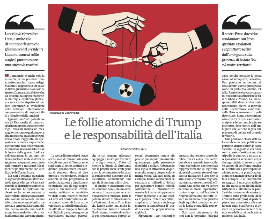 La scelta di riprendere i test, o anche solo di minacciarli visto che gli annunci di Trump sono stati come al solito confusi e indefiniti, può innescare una catena di reazioni. Mosca si dice pronta a «rispondere», Pechino accelera il suo programma di modernizzazione e ampliamento nucleare (che già oggi rappresenta il più massiccio investimento qualitativo e quantitativo della storia recente) mentre la Corea del Nord continua a dare dimostrazioni di forza attraverso lanci di missili e simulazioni. Allo stesso tempo, la Nato, di cui l’Italia fa parte, prosegue con esercitazioni nucleari periodiche in cui vengono addestrati equipaggi e mezzi per l’utilizzo di ordigni atomici. Tutto ciò mentre la Russia fa altrettanto con le proprie forze strategiche e con la continuazione dei piani di condivisione nucleare con la Bielorussia, alimentando una spirale di tensione e di rischio.