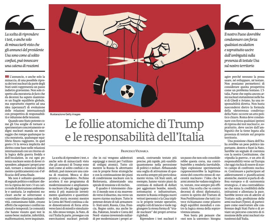 NUCLEARE La scelta di riprendere i test, o anche solo di minacciarli visto che gli annunci del presidente Usa sono come al solito confusi, può innescare una catena di reazioni. Mio editoriale per Il Manifesto.