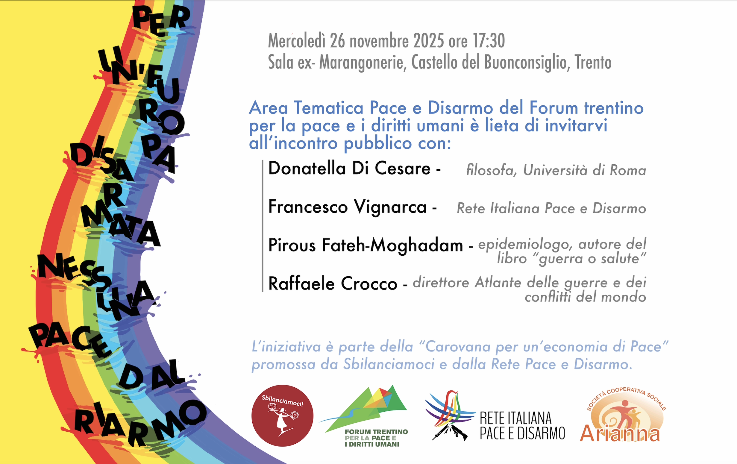 L’iniziativa si inserisce nel percorso di sensibilizzazione del Forum Trentino per la Pace e i Diritti Umani, che da anni promuove una cultura di pace, giustizia e solidarietà ed è parte della campagna Stop Rearm Italia e della “Carovana per un’economia di Pace” promossa da Sbilanciamoci e da Rete Italiana Pace e Disarmo”