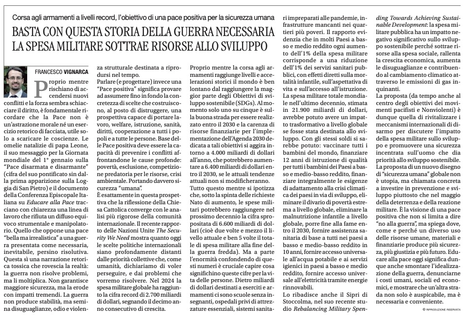 Parlare (e progettare) invece una “Pace positiva” significa provare ad assumere fino in fondo la concretezza di scelte che costruiscono, al posto di distruggere, una prospettiva capace di portare lavoro, welfare, istruzione, sanità, diritti, cooperazione a tutti i popoli e a tutte le persone. Base delle Pace positiva deve essere la capacità di prevenire i conflitti affrontandone le cause profonde: povertà, esclusione, competizione predatoria per le risorse, crisi ambientale. Portando davvero sicurezza “umana”. È esattamente in questa prospettiva che la riflessione della Chiesa Cattolica converge con le analisi più rigorose della comunità internazionale. Il recente rapporto delle Nazioni Unite The Security We Need mostra quanto oggi le scelte politiche internazionali siano profondamente distanti dalle priorità collettive che, come umanità, dichiariamo di voler perseguire, e dai problemi che vorremo risolvere. Nel 2024 la spesa militare globale ha raggiunto la cifra record di 2.700 miliardi di dollari, segnando il decimo anno consecutivo di crescita.