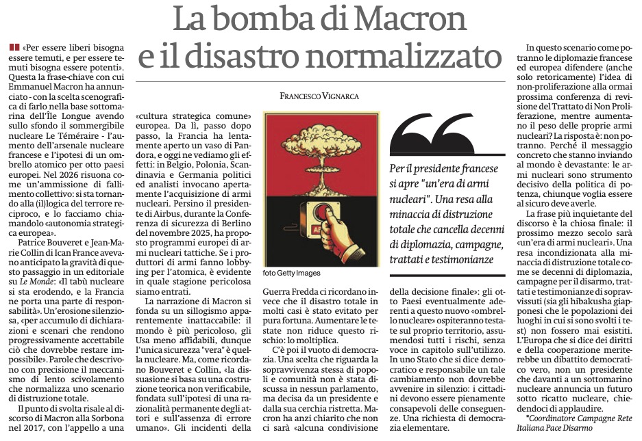 RIARMO Per il presidente francese si apre “un’era di armi nucleari”. Una resa alla minaccia di distruzione totale che cancella decenni di diplomazia, campagne, trattati e testimonianze. Un mio commento per il Manifesto.
