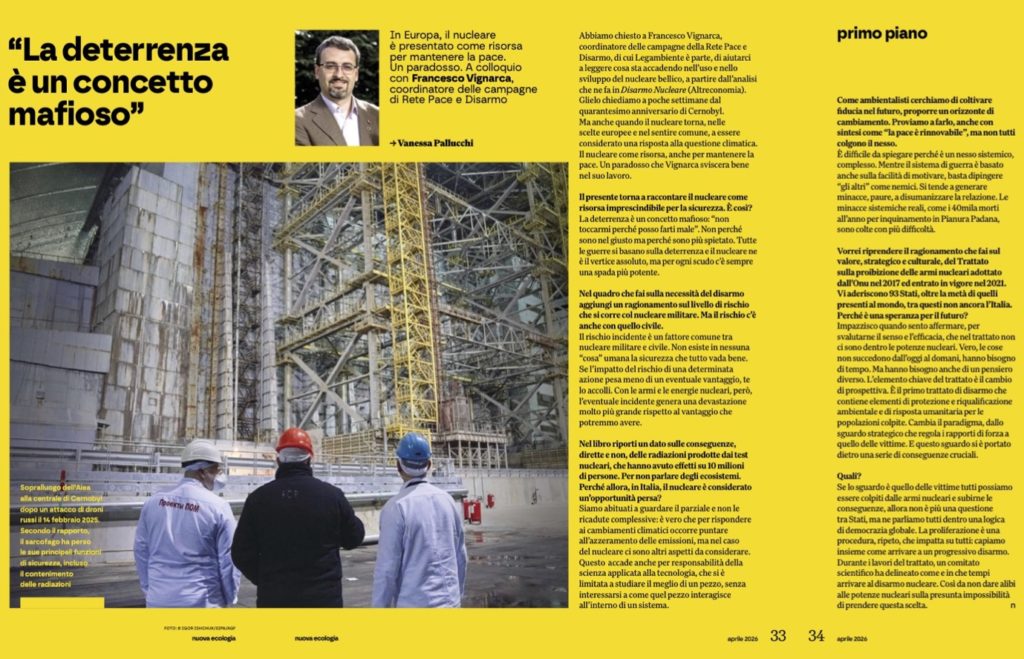 In Europa, il nucleare è presentato come risorsa per mantenere la pace. Un paradosso. A colloquio con Francesco Vignarca, coordinatore delle campagne di Rete Pace e Disarmo – su “La Nuova Ecologia” di aprile 2026, a cura di Vanessa Pallucchi