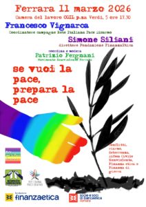 Se vuoi la pace, prepara la pace 🏳️🌈 Parleremo di conflitti, riarmo, deterrenza, difesa civile nonviolenta, finanza etica e finanza di guerra, all’iniziativa pubblica che si terrà mercoledì 11 marzo alle ore 17.30 in Camera del Lavoro a Ferrara (Piazza Verdi, 5) con Francesco Vignarca coordinatore campagne Rete Italiana Pace Disarmo, Simone Siliani, direttore Fondazione FinanzaEtica. Coordina e modera Patrizio …